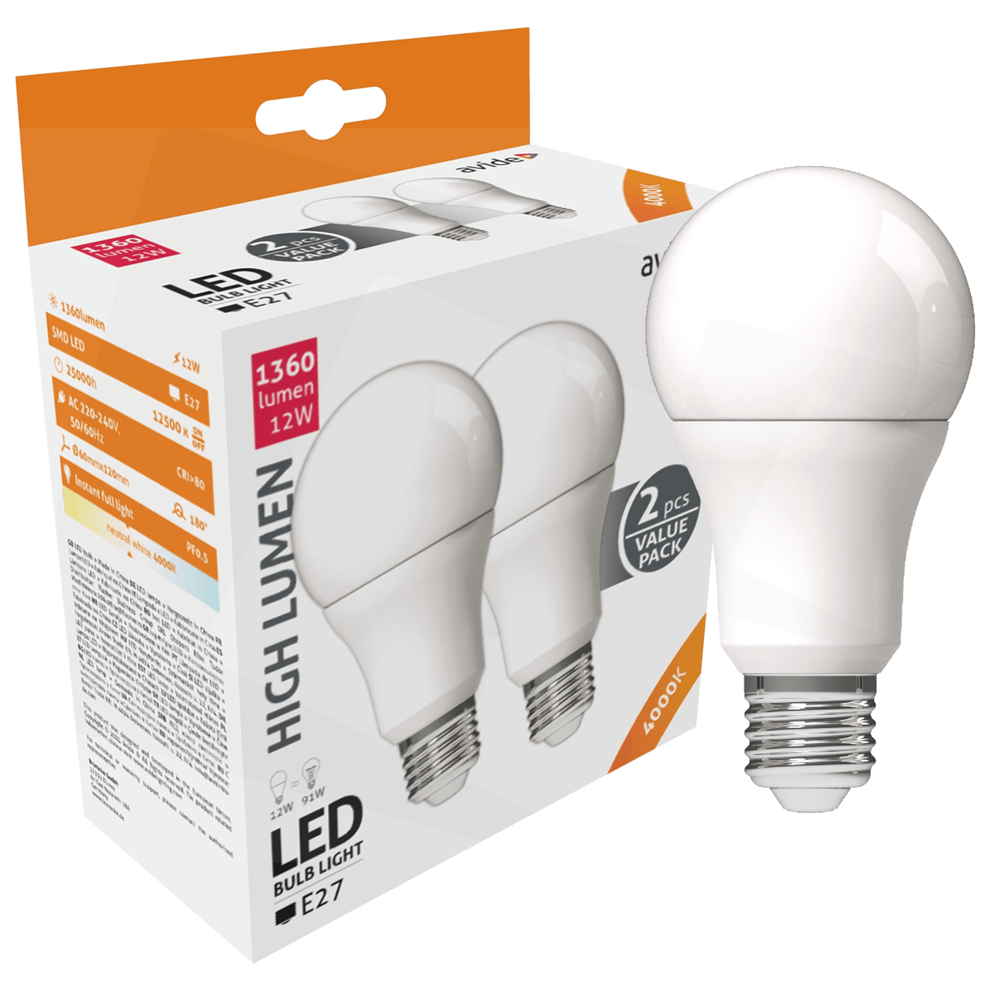 Sijalica A60, LED 12W, ekvivalent 91W, E27, svjetlost 1360 lm, temperatura svjetlosti 4000K, snop svjetlosti 180°, radni vijek 25.000 h., dimenzije Ø 60 x 120 mm, IP20, pakiranje 2 kom.