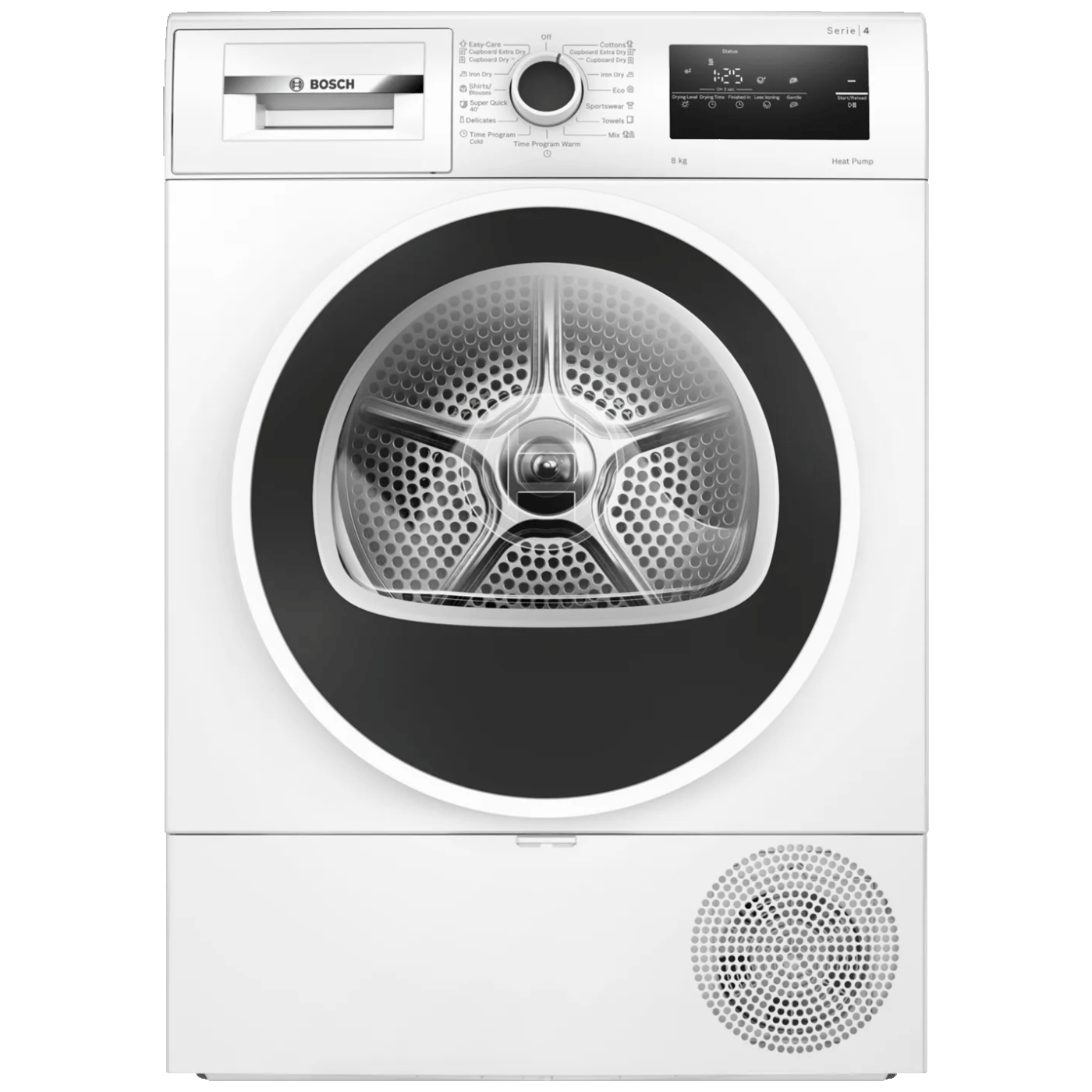 Ovaj model može osušiti do 8 kg rublja — dovoljno za tjedne potrebe prosječnog domaćinstva. Koristi AutoDry tehnologiju, koja automatski mjeri vlagu i prilagođava trajanje sušenja kako bi spriječila prekomjerno sušenje i oštećenje tkanina.