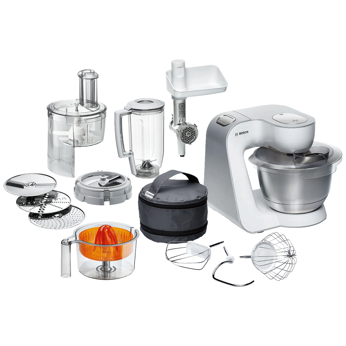Ovaj kuhinjski aparat dolazi sa višenamjenskim dodacima, uključujući sjeckalicu za rezanje, mljevenje i ribanje, blender za pripremu ukusnih smoothieja, mesoreznice za pripremu mesnih proizvoda i cijedilo za argume za svježe sokove. Uz to, ovaj aparat dolazi sa metlicama za mješanje, tučenje i gnječenje, što Vam omogućava da pripremite bilo koju vrstu tijesta ili smjese.