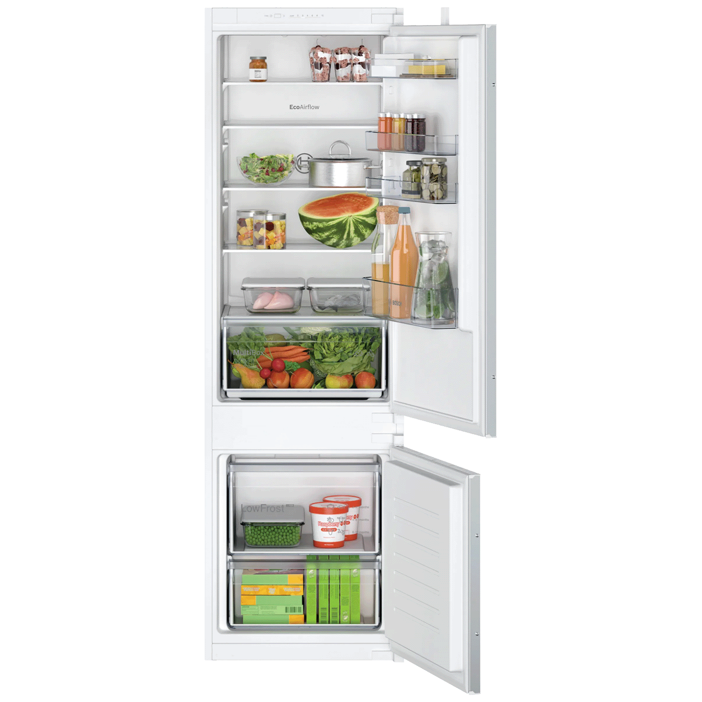 Bosch KIV87NSE0 je potpuno integrirani kombinirani uređaj dizajniran da se uklopi u modernu kuhinju bez vidljivih eksterijernih komponenti. S ukupnim zapreminskim kapacitetom od 270 litara, savršen je za korisnike koji žele balans između hlađenja i zamrzavanja — sa funkcijama koje olakšavaju svakodnevnu uporabu i čuvanje svježine hrane.