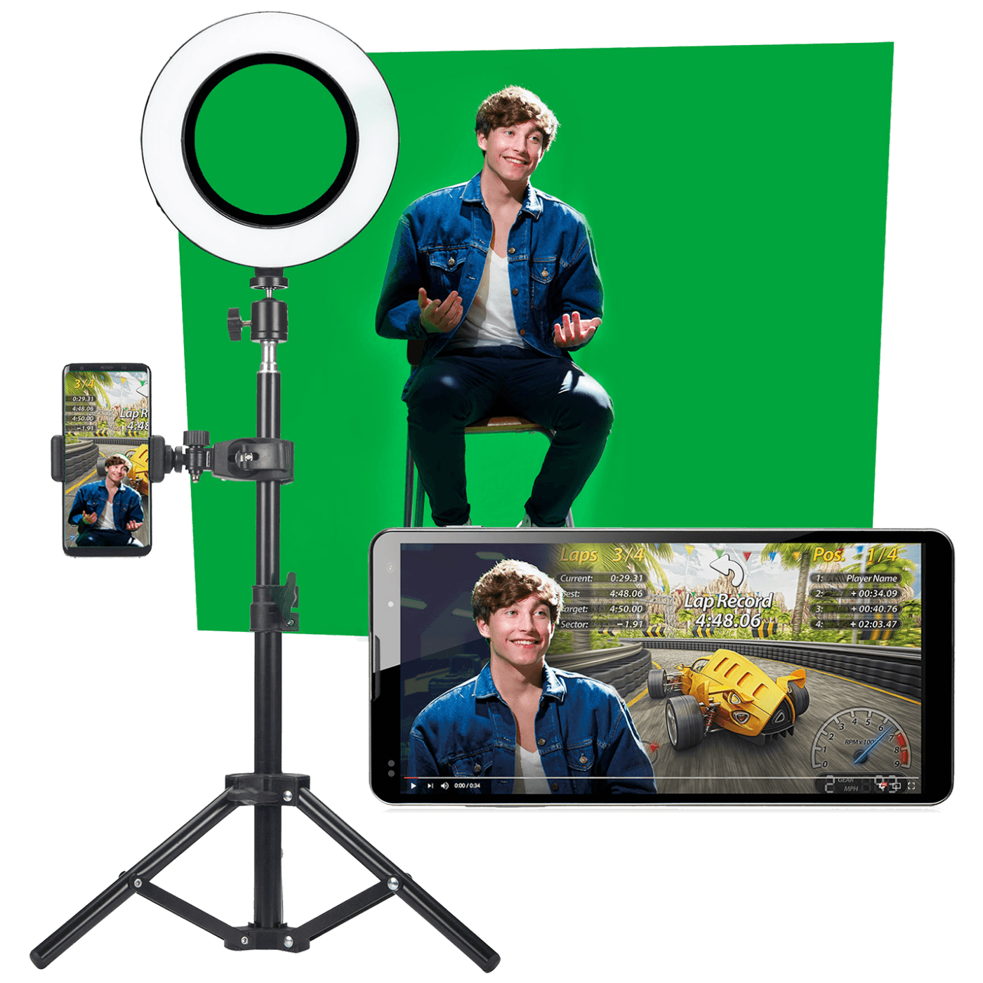 Studio komplet sa zelenim ekranom, stativom sa držačem za pametni telefon, mikrofonom i video svjetlom