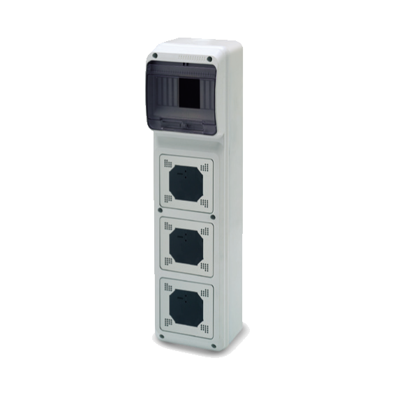 Kombinovani kutija za osigurače i industrijske utičnice, nadžbuk , 6 osigurača, 3 utičnice, IP65 zaštita, IK08 standard otpornosti na udar.