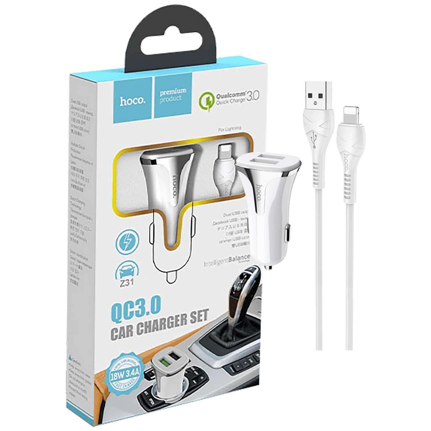 hoco. Auto punjač sa Lightning kabelom, QC, 2 x USB, 3.1 A – Z31 Universe double port, Lightning