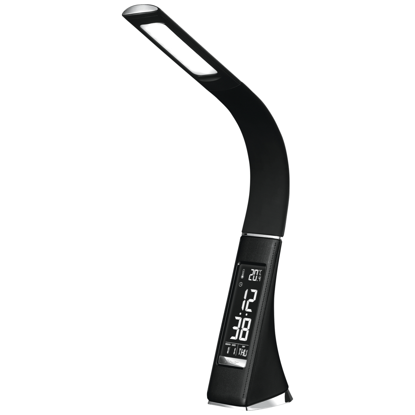 LED stolna lampa, 3 razine svjetlosti osjetljive na dodir, bijeli LCD zaslon, prikaz na LCDzaslonu: sat, 12/24 format, termometar, kalendar, dan u tjednu, alarm, izvor svjetlosti 25 LED lampica, 7W, osvjetljenje 400lm, boja svjetlosti hladno bijela – 5000K, fleksibilna, napajanje adapter USB 5V / 1A / 1 x CR2032 baterija