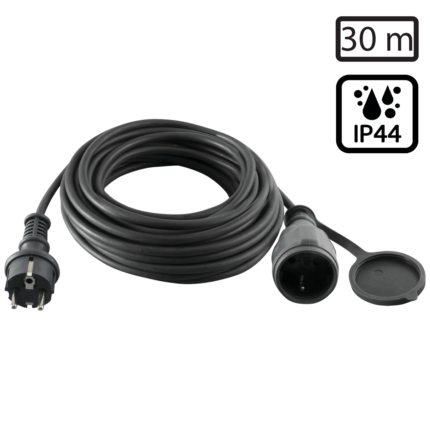 Produžni strujni kabel, 1 utičnica sa poklopcem, gumirani fleksibilni kabel, H05RR-F, 3 x 1,00 mm², utikač ravni, uzemljena utičnica, dužina kabela 30 met., 250 V / 10 A / 2300 W, IP 44 standard, boja crna