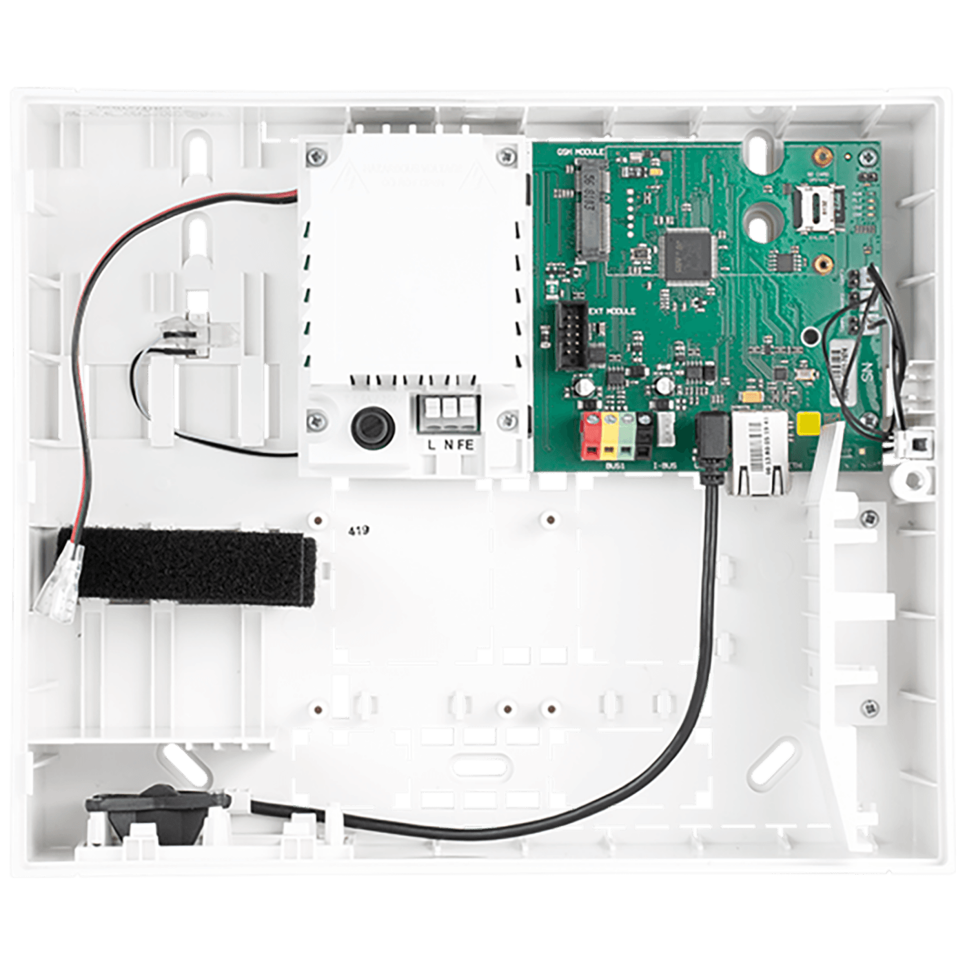 Kontrolna ploča sa LAN komunikatorom, do 50 bežičnih ili BUS zona, 8 sekcije, do 50 korisnika, 32 programibilnih PG izlaza, radna frekvencija 868.1 MHz, radna temperatura -10°C do +40°C, napajanje 230V / 50Hz / 0.28A, backup baterija 12V / 2.6Ah