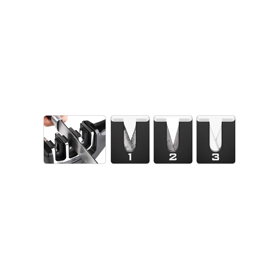 | Ostalo | Brusač noževa u 3 faze izrađen od omekšane ABS plastike s bazom protiv proklizavanja. Brusni diskovi: dijamantni kamen za popravke oštrice i ravnanje prije brušenja. Disk od nehrđajućeg volframa oštri rub i vraća “V oblik” oštrici, a keramički kamen brusi oštricu i izglađuje površinske nepravilnosti. Čistite vlažnom krpom. Brusni diskovi ne mogu se zamjenjivati. |