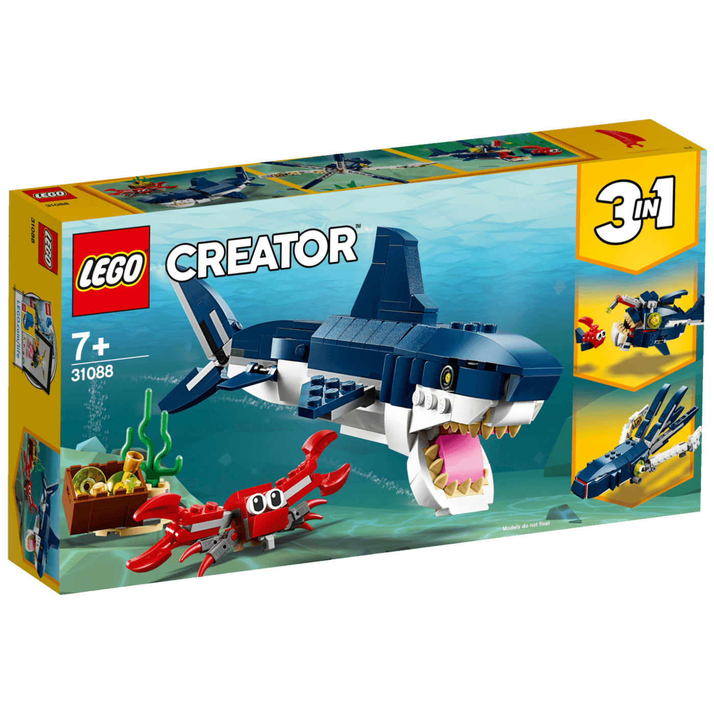 Zaroni u oceansku pustolovinu u setu LEGO® Creator 3-u-1 Bića iz morskih dubina. Pomozi slatkom raku iz morskih dubina da zaštiti kovčeg s blagom od velikog strašnog morskog psa s raljama, šiljastim zubima, reflektirajućim očima i snažnim repom kojim mlatara! Kada poželiš još podvodne zabave, pretvori ga u fleksibilnu lignju ili grdobinu s divovskim ustima.