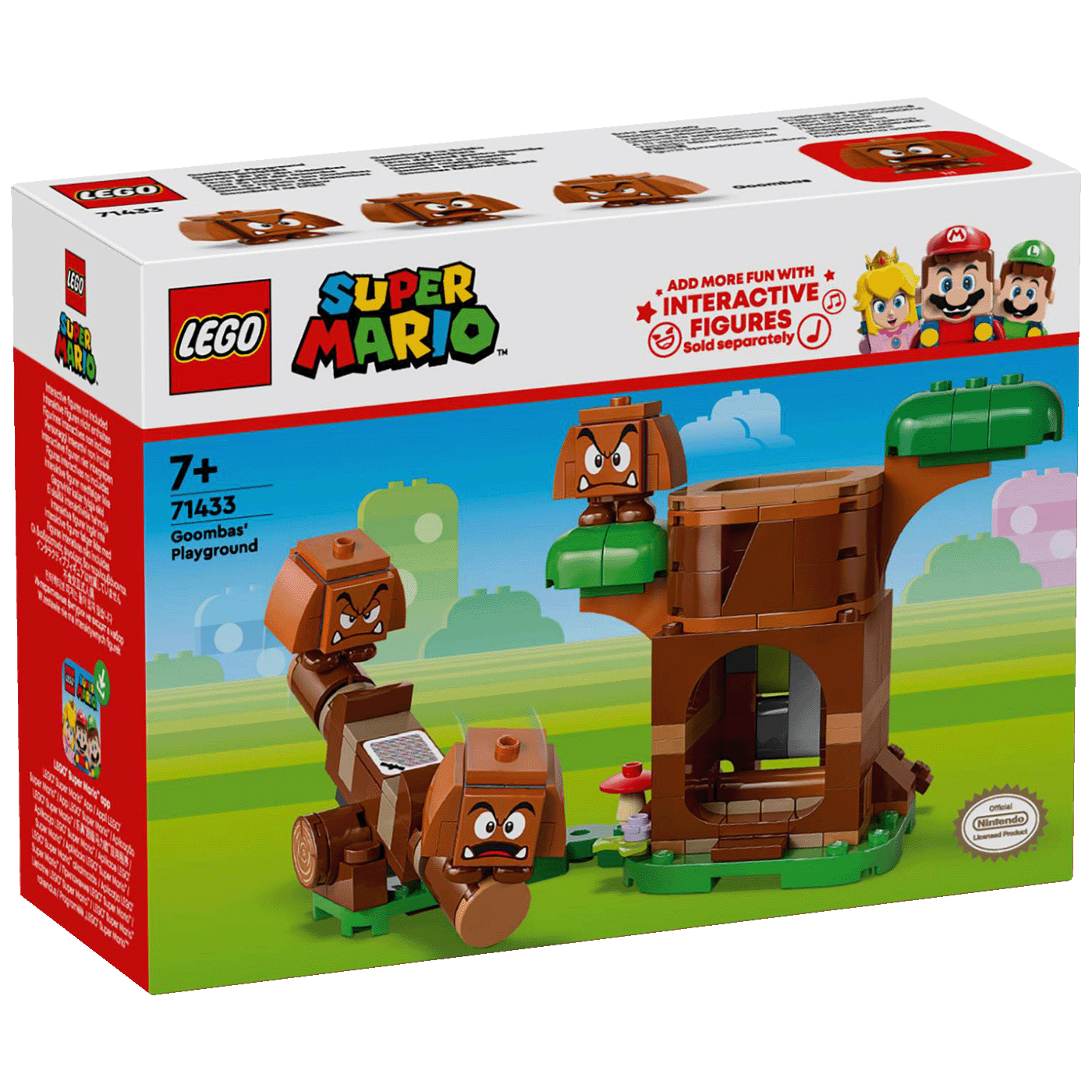 Zabavi se na Goombinom igralištu u setu LEGO Super Mario. Pritisni polugu da Goomb iskoči iz drveta. Igraj se na klackalici s Goombama. Stavi tri Goombe jednog na drugog i napravi kulu Goomba. LEGO Mario, LEGO Luigi ili LEGO Peach (figure nisu dio kompleta) mogu doći na igralište i isprobati se u interaktivnom izazovu održavanja ravnoteže na klackalici!