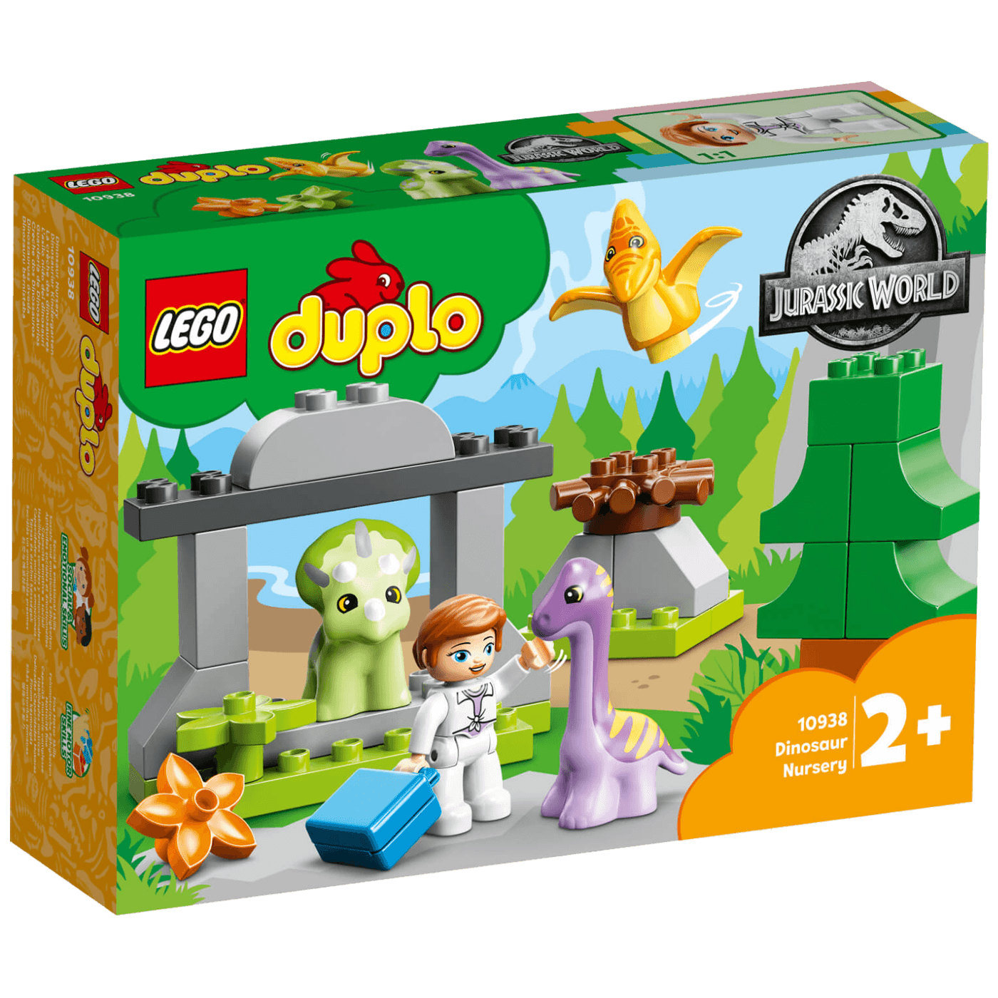 Mali ljubitelji životinja mogu se pridružiti Claire Dearing iz Jurskog svijeta dok se brine za 3 mala dinosaura. U kompletu dolaze Triceratops u špilji, Pteranodon u gnijezdu i Brachiosaurus s dugim vratom da može grickati lišće s drveća. Dok se vaš mali učenik igra s preslatkim dinosaurima u šumskim staništima, razvija fine motoričke vještine i emocionalnu inteligenciju.