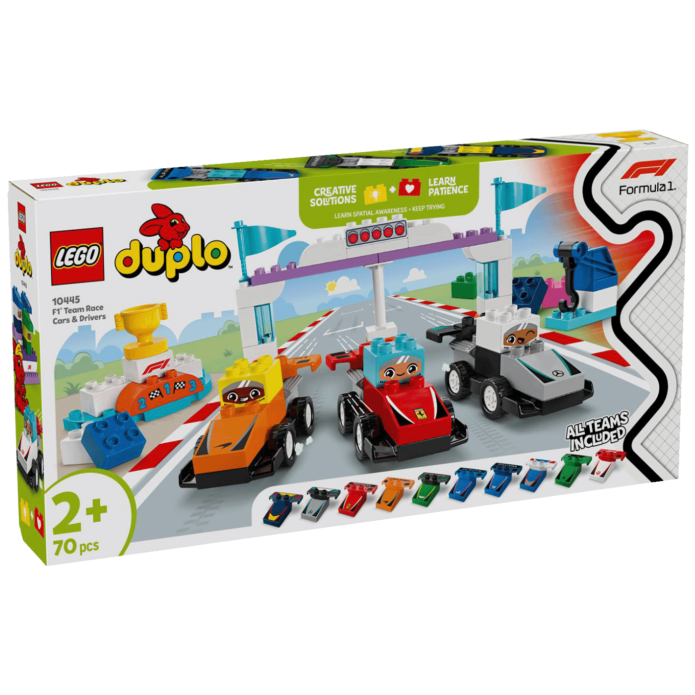 Uključite motore i pripremite se za utrku u kompletu za slaganje Trkaći automobili i vozači timova za F1 (10445). U zabavnoj obiteljskoj aktivnosti obožavatelji i mlada posada u boksu mogu doživjeti uzbuđenja s utrka Formule 1.