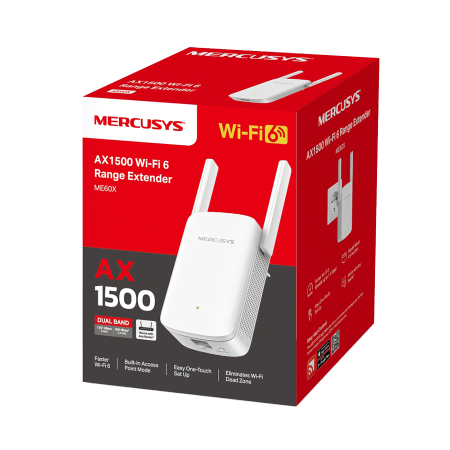 MERCUSYS ME60X AX1500 Wi-Fi Range Extender, 2.4 GHz + 5 GHz, 2×Fixed External Antennas, 1×G Port, Wall Plugged