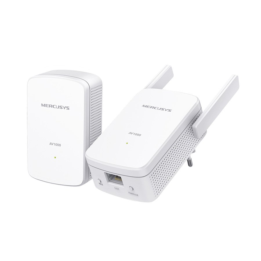 Mercusys MP510 KIT AV1000 Gigabit Powerline N300 Wi-Fi KIT (1× MP510 + 1× MP500) 300 Mbps na 2,4 GHz, 1000 Mbps Powerline, Broadcom CPU, 1× Gigabitni port, 2× fiksna, spoljna zidna antena, AV antena2 Plug and Play, Wi-Fi konfiguracija jednim dodirom.