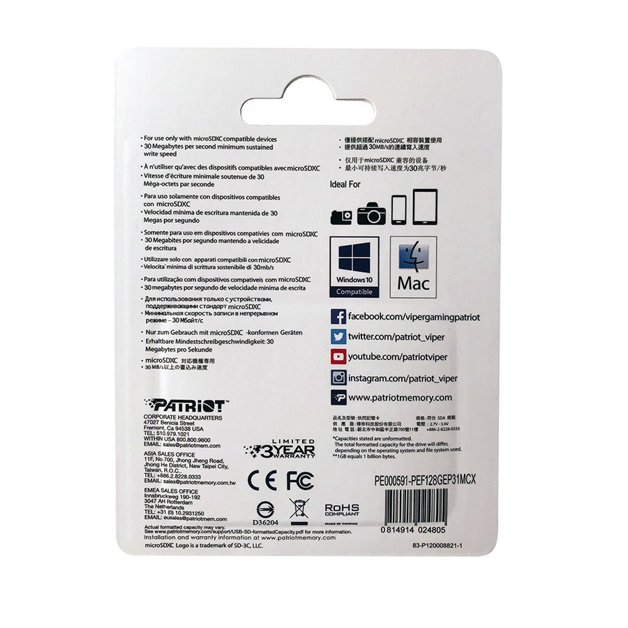 MICRO SD PATRIOT 128GB V30, 4K Video Rec. Read speed up to 100MB/s | write speed up to 80MB/sPEF128GEP31MCX