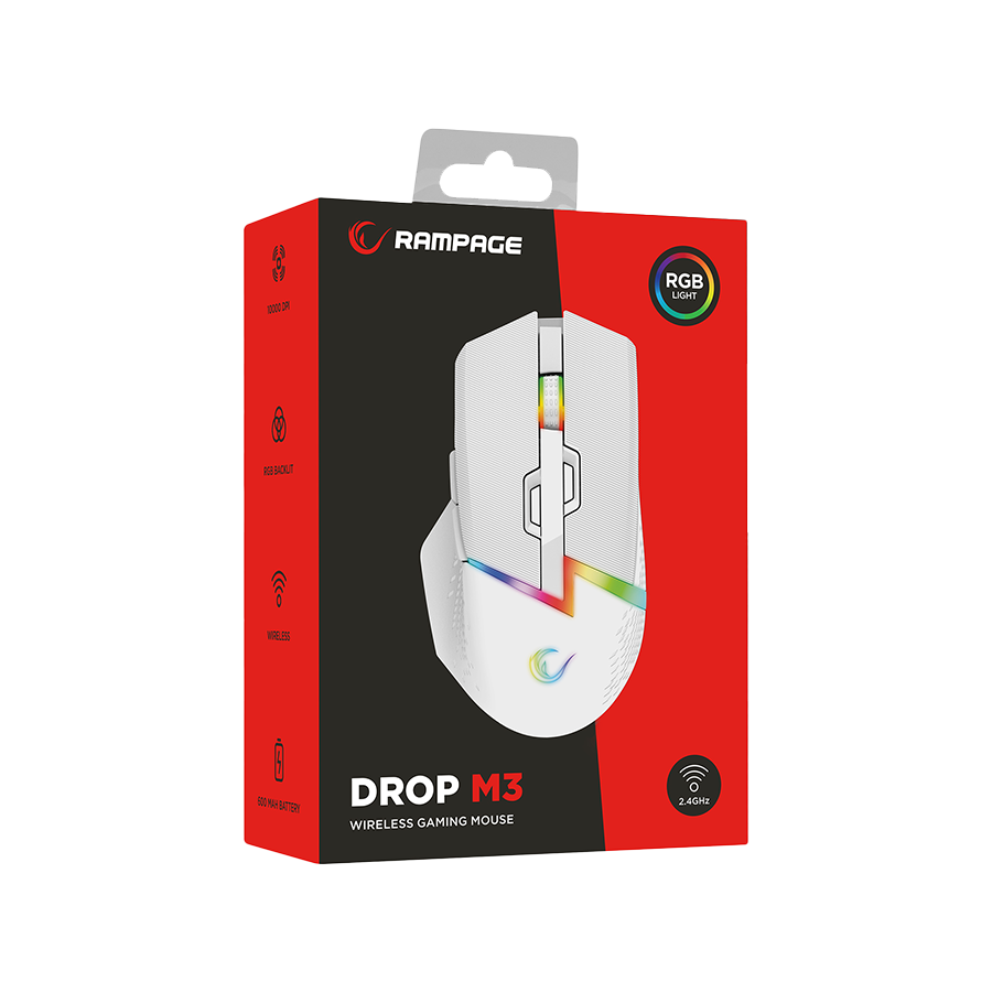Miš gaming RAMPAGE DROP M3 V2 24000 DPI 3311 Sensor White RGB Rechargeable Wireless 80 Million Huano Switch Gaming Mouse