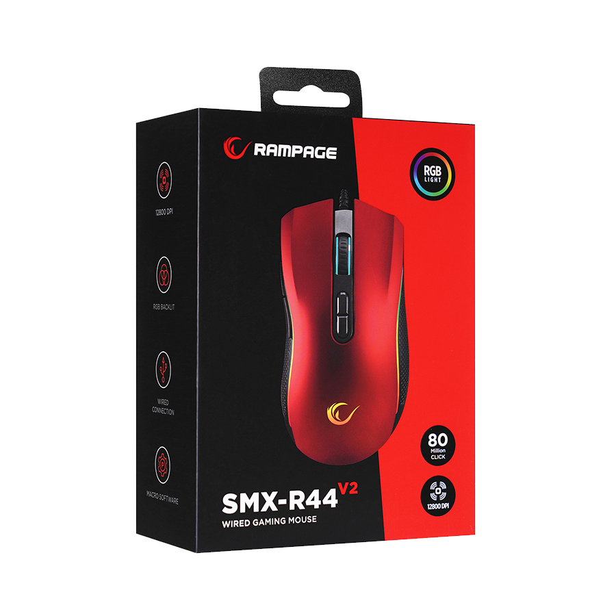 Miš gaming RAMPAGE SMX-R44 V2 Macrol Red 2800 DPI RGB LED 80 Million Huano Switch Gaming Player Mouse, 41490