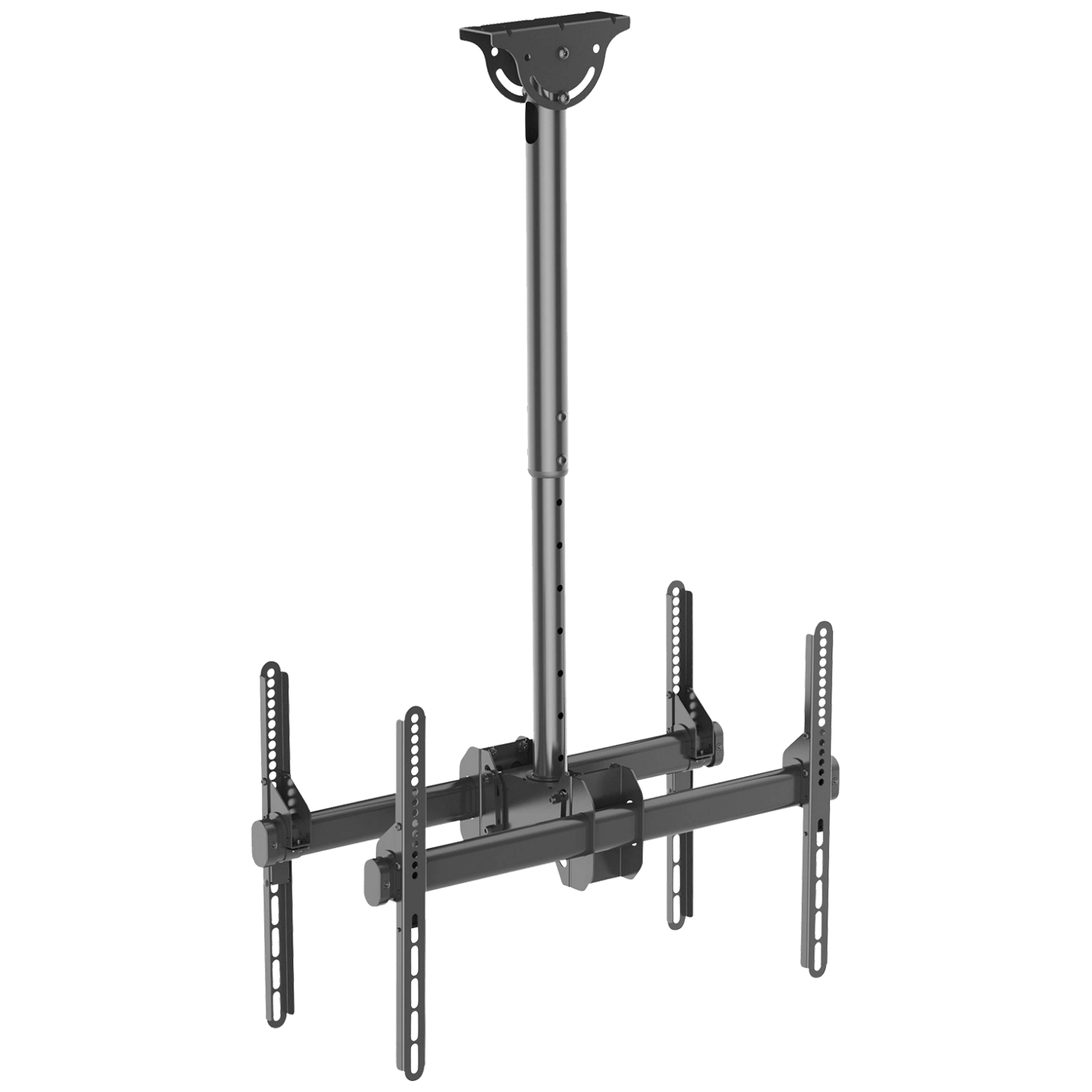 Nosač za 2 TV prijemnika 37" do 70", udaljenost od stropa do 910 mm, mogućnost montaže na kosi strop do 60 °, maximalno opterećenja 2 x 45 kg, VESA 600 x 400, 200 x 200, jednostavna montaža, podesiva visina, zakretanje 360 °, nagib + 5 ° / – 20 °, horizontalno podešavanje +/- 3 °, kabel management, pribor za montažu