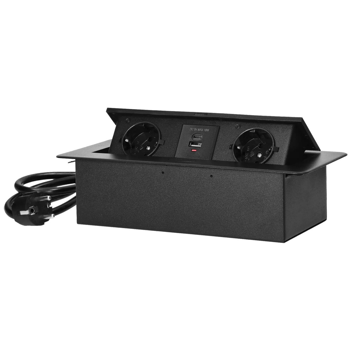 Produžni kabel sa dvije Schuko utičnice, sa uzemljenjem i zaštitom strujnog kruga, u kombinaciji s USB punjačima ugrađenim u kućište koje se može integrirati u stolove, radne površine, može se montirati i okomito i vodoravno, pružajući praktičan pristup električnim utičnicama.