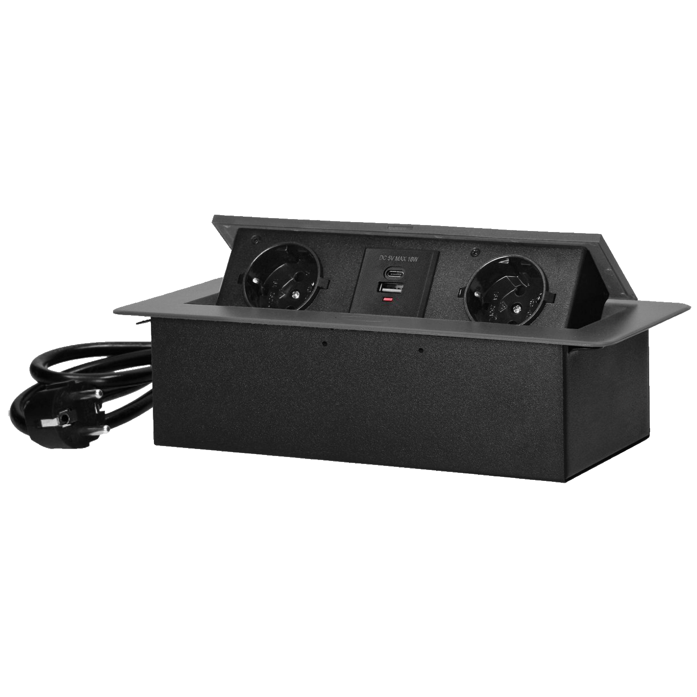 Produžni kabel sa dvije Schuko utičnice, sa uzemljenjem i zaštitom strujnog kruga, u kombinaciji s USB punjačima ugrađenim u kućište koje se može integrirati u stolove, radne površine, može se montirati i okomito i vodoravno, pružajući praktičan pristup električnim utičnicama.