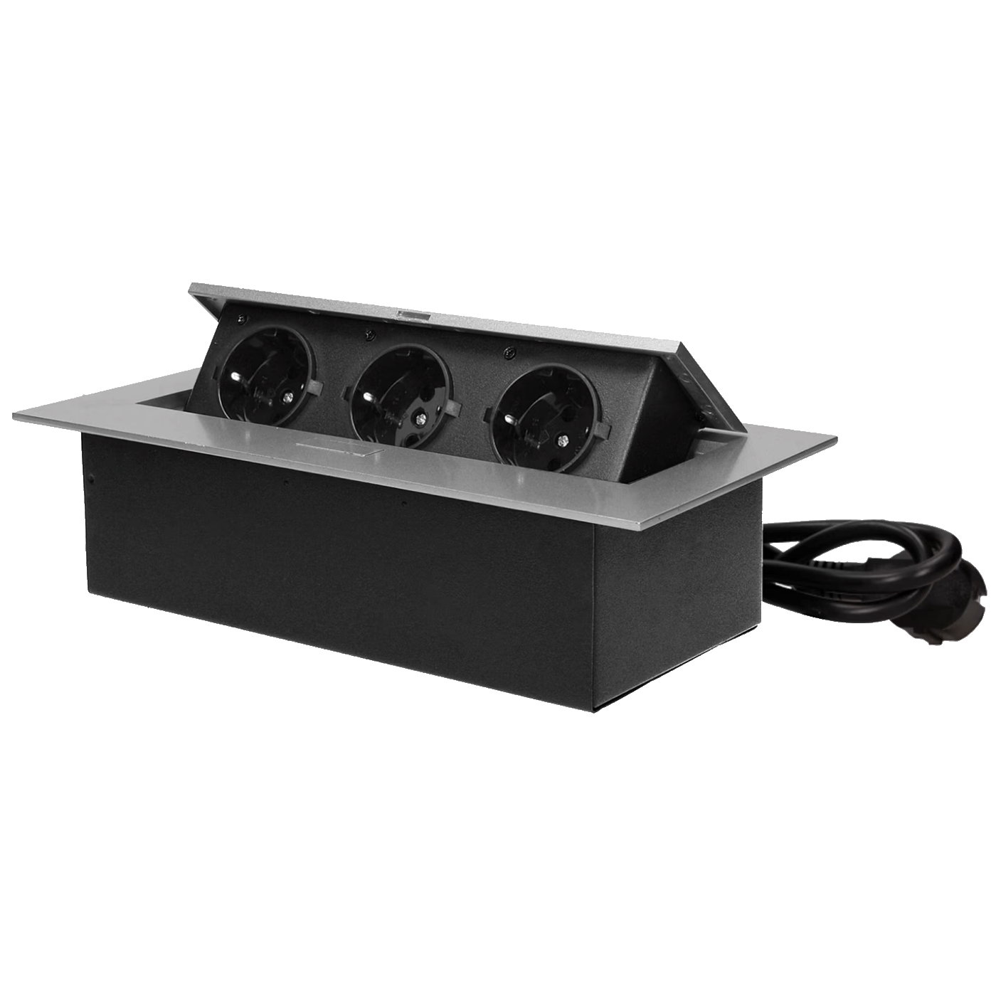 Produžni kabel sa tri Schuko utičnice, sa uzemljenjem i zaštitom strujnog kruga, ugrađenim u kućište koje se može integrirati u stolove, radne površine, može se montirati i okomito i vodoravno, pružajući praktičan pristup električnim utičnicama.