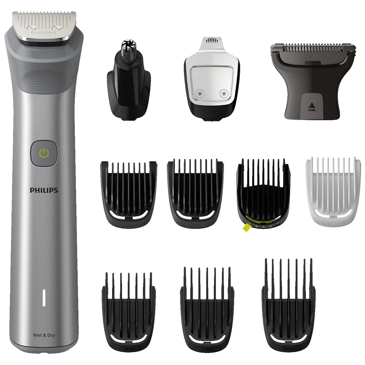 Ovaj višenamjenski trimer namijenjen je kompletnom uređivanju brade, kose i tijela. Dolazi s 12 različitih nastavaka koji omogućuju precizno oblikovanje i šišanje za sve stilove. Samoštrareći čelični noževi zadržavaju oštrinu bez potrebe za uljem, dok tehnologija BeardSense automatski prilagođava snagu prema gustini dlačica. Trimer je potpuno vodootporan, baterija traje do 120 minuta, a ergonomska gumirana drška osigurava udobno i sigurno rukovanje.