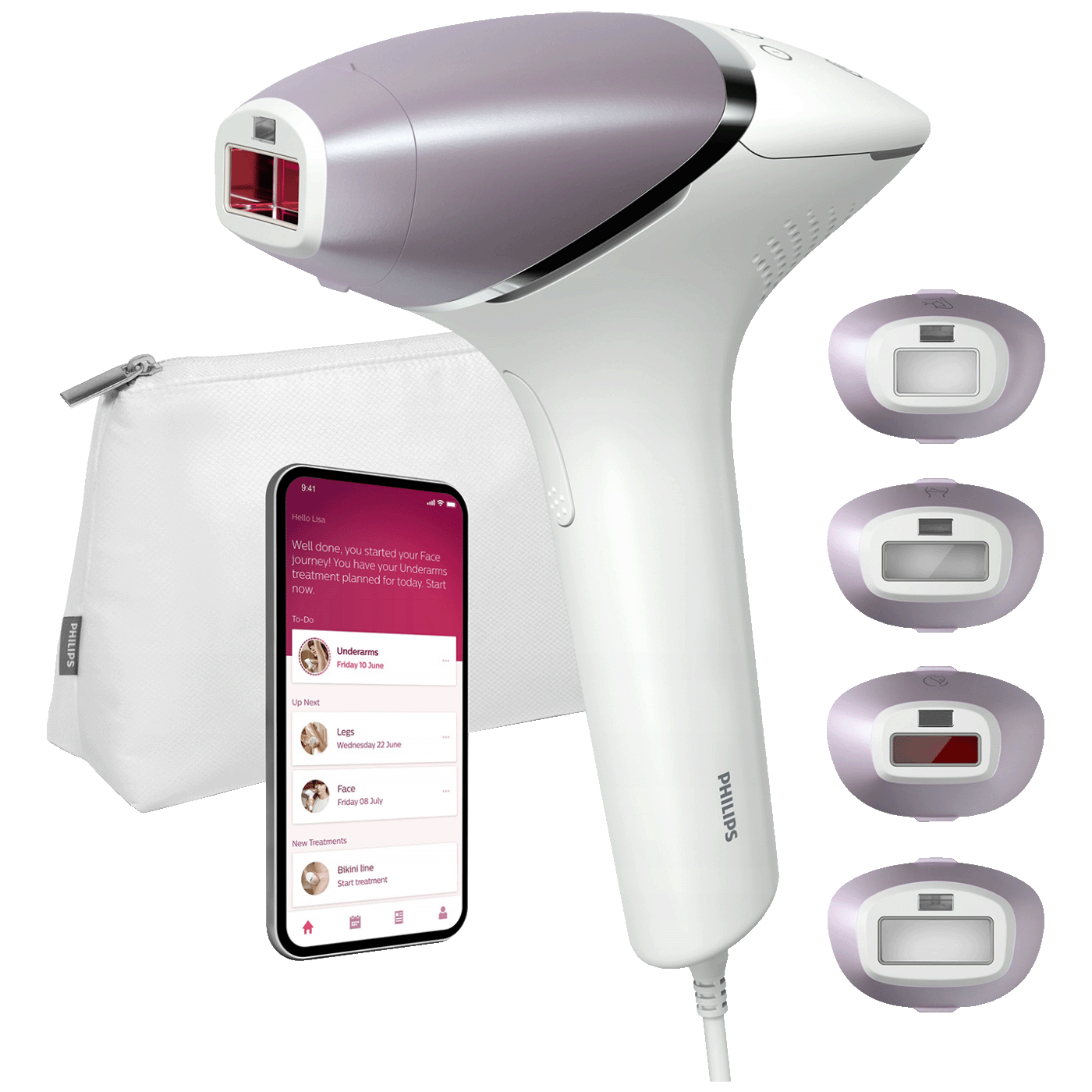 Posebno dizajnirani dodaci savršeno pristaju oblinama vašeg tijela i pokreću najučinkovitije programe za svako područje tijela kada su povezani. Lice: ravan dizajn i mali prozor s UV filterom. Tijelo: zakrivljeno prema unutra s velikim prozorom. Bikini i pazuh: Zakrivljeni prema van za teško dostupna područja.