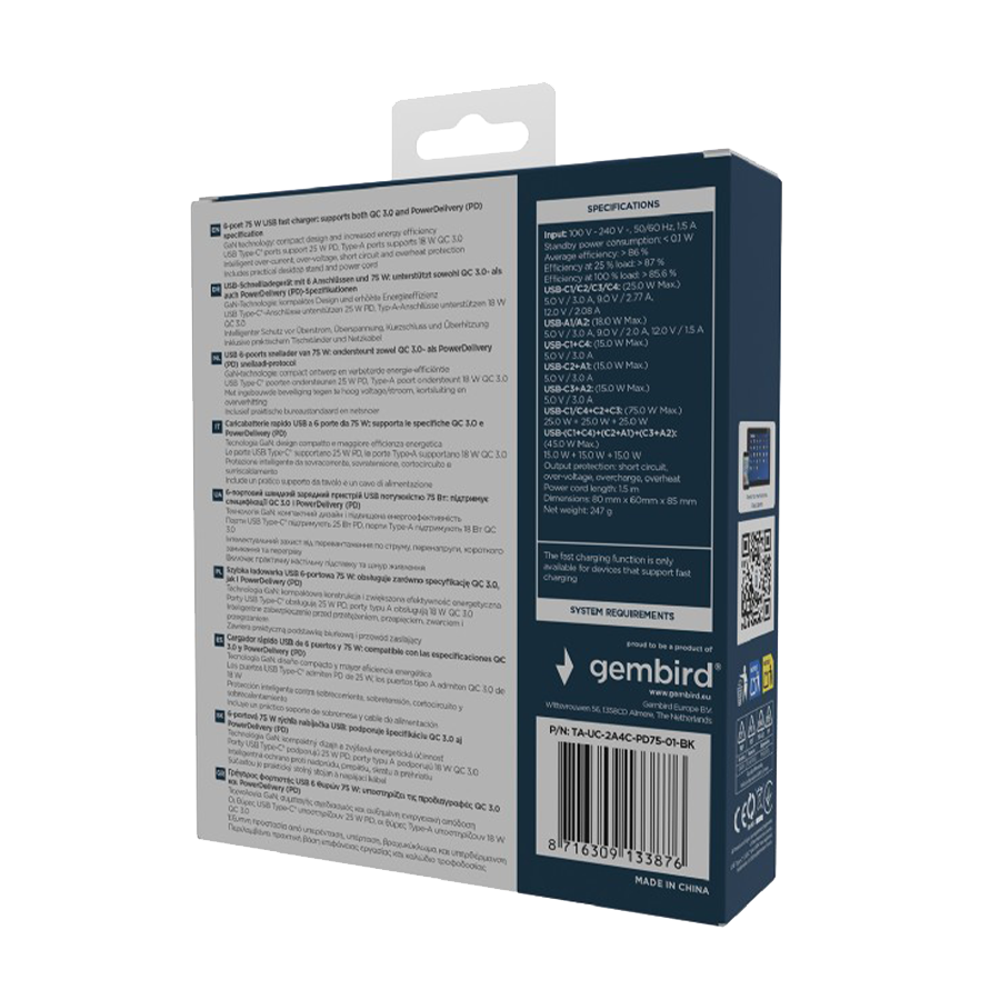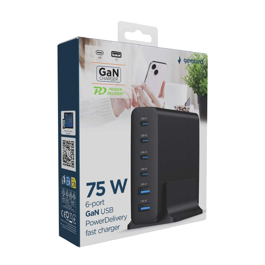 Power station USB brzi/quick punjač GEMBIRD, 6-port 75W GaN USB fast charger, black, Type-C, USB, TA-UC-2A4C-PD75-01-BK