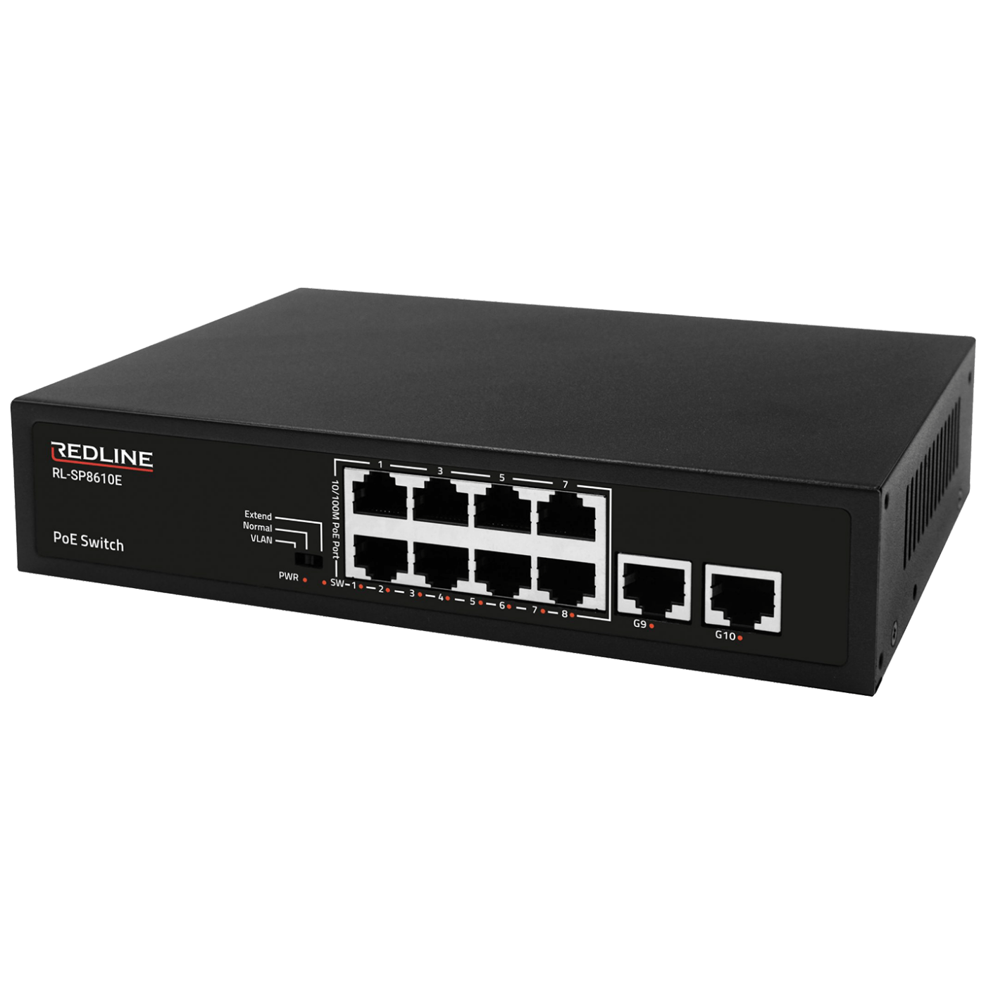 10 portni mrežni 10/100 switch, 8 PoE port, RJ 45, max 120 W, PoE 30 W max. po izlazu, napajanje 100-240 V 50/60 Hz, radna temperatura -10 °C – 55 °C
