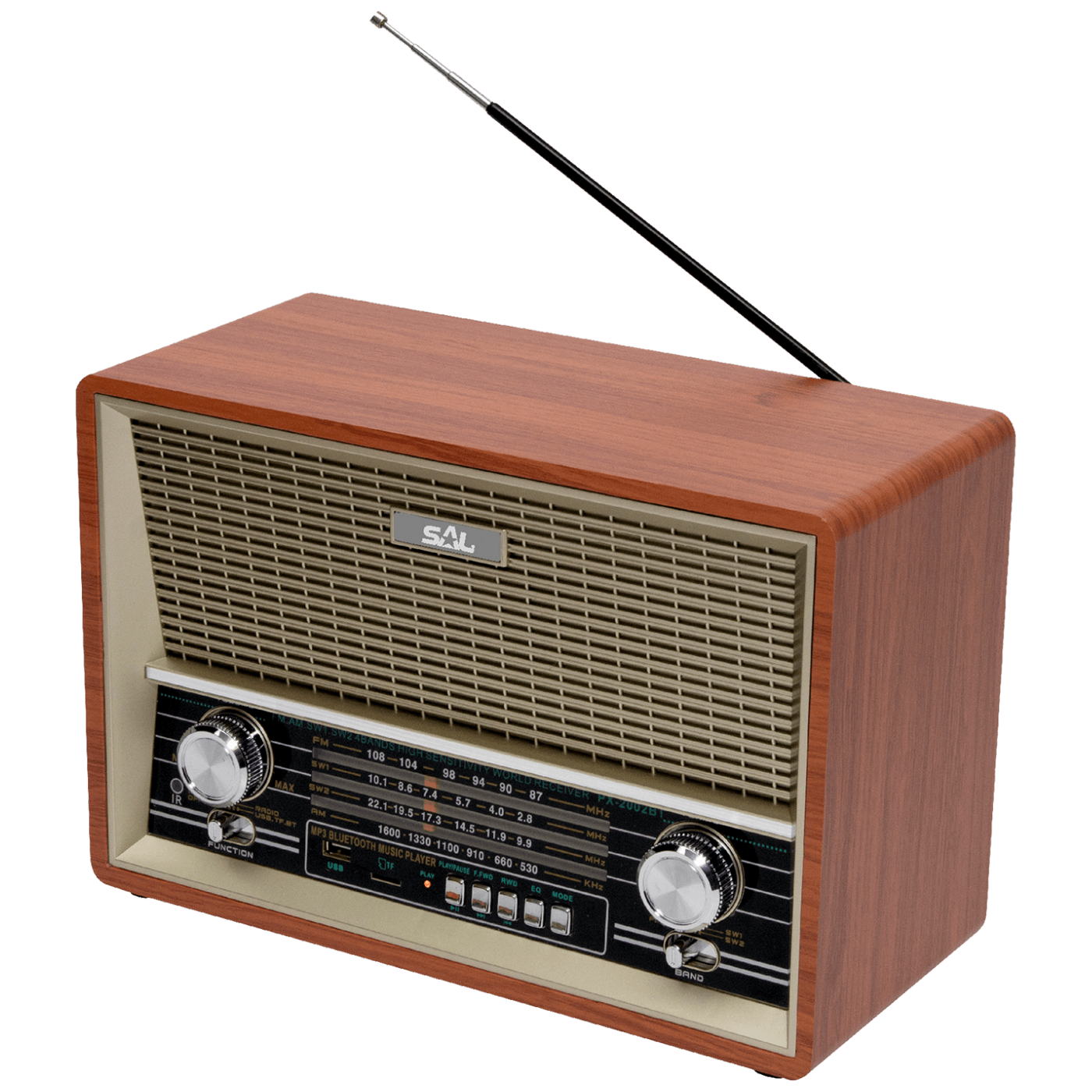 Radio prijemnik, 4in1, RETRO dizajn, bežična Bluetooth veza, MP3 reprodukcija, žičani audio ulaz ( AUX IN ), 4- pojasni AM / FM / SW1 / SW2 radio. priključak za slušalice 3.5 mm, klasična drvena zvučna kutija sa dva zvučnika.