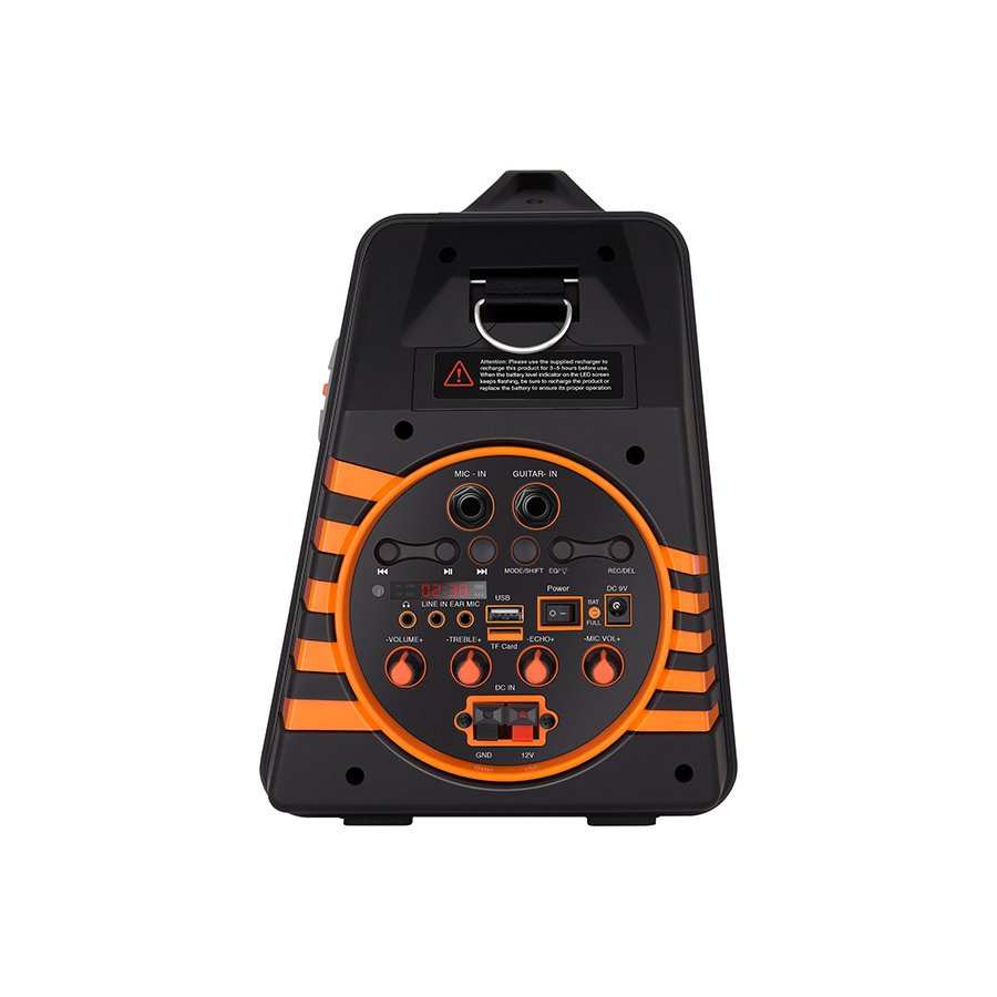 | Ostalo | FM PLL Radio LED zaslon Karaoke s funkcijom ECHO i podešavanjem glasnoće Ugrađena baterija 3000 mAh Li-Ion Vrijeme reprodukcije na bateriju do 10 sati (50% volume level) Punjenje 9 V (LED indikator) ili 12 V Aux izlaz (Mono) Pribor: punjač (DC 9 V, 1A), mikrofon 5m kabal, remen za nošenje, aux kabel od 3,5 m Dimenzije: 530 x 210 x 308 mm Težina: 4,9 kg |