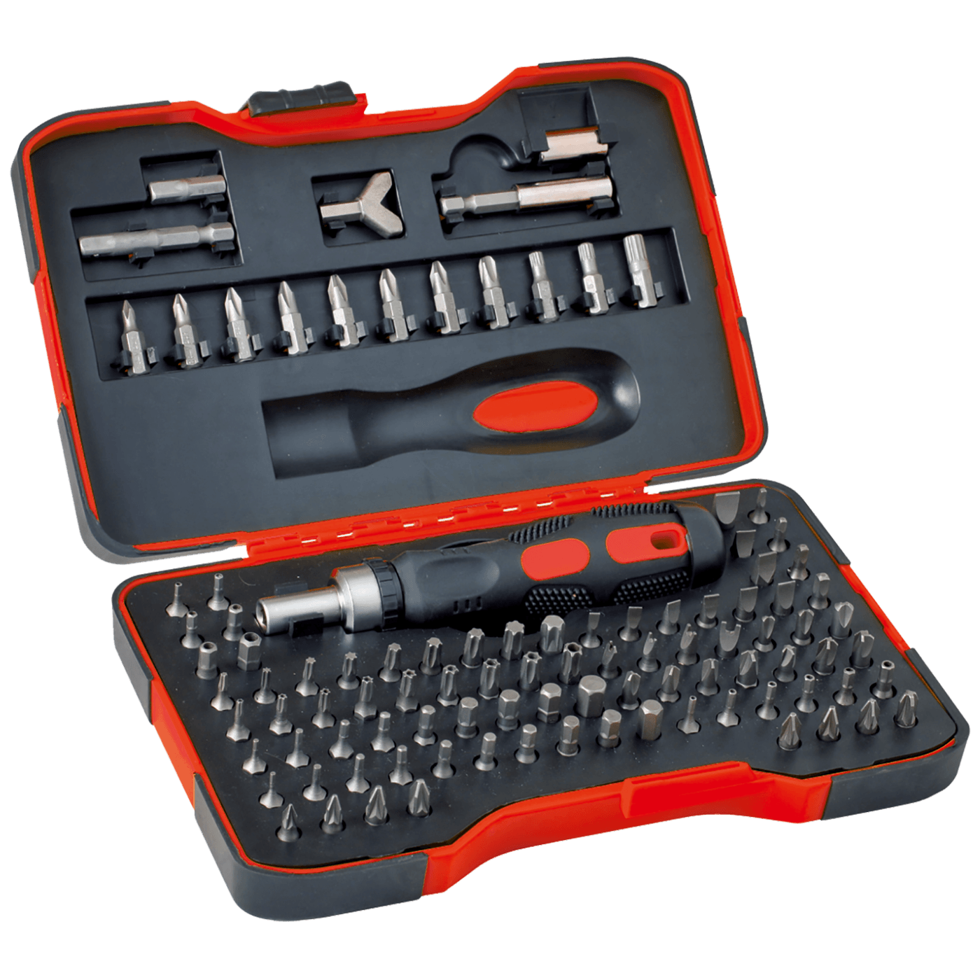 Set preciznih odvijača za rad doma. Gumirana ručka dužine 150 mm i zakretna glava. Set sadrži 101 kom. bitova pakiranih u praktičnu kutiju.