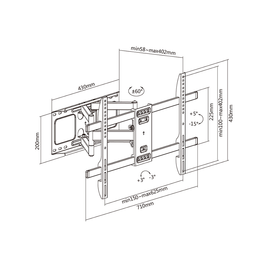| Funkcija i ugradnja | Nagib prema dolje 15 Okretanje +/- 60° Ispravak razine +/- 3° Najmanja udaljenost od zida 5,8 cm Najveća udaljenost od zida 40,2 cm |
