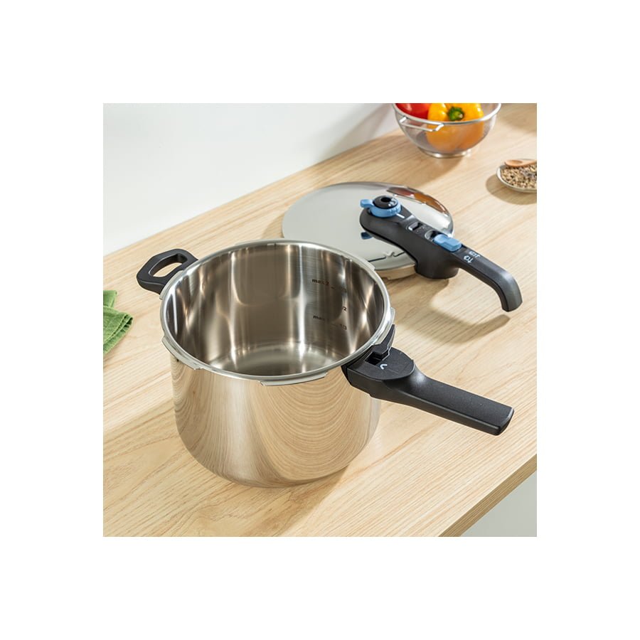 | Sigurnosni sistem od 5 tačaka | Zahvaljujući promišljeno dizajniranim sigurnosnim funkcijama, imat ćete mir dok kuhate. Ekspres lonac može započeti ekspresno kuhanje samo kada je poklopac zatvoren i zaključan. Radni ventil reguliše pritisak. Ako se otvor za paru začepi, sigurnosni ventil preuzima funkciju, nakon čega na kraju dolazi do deformacije gumice; garantujući sigurnost. Na kraju, drška za otvaranje može se koristiti samo kada ekspres lonac nije pod pritiskom. |