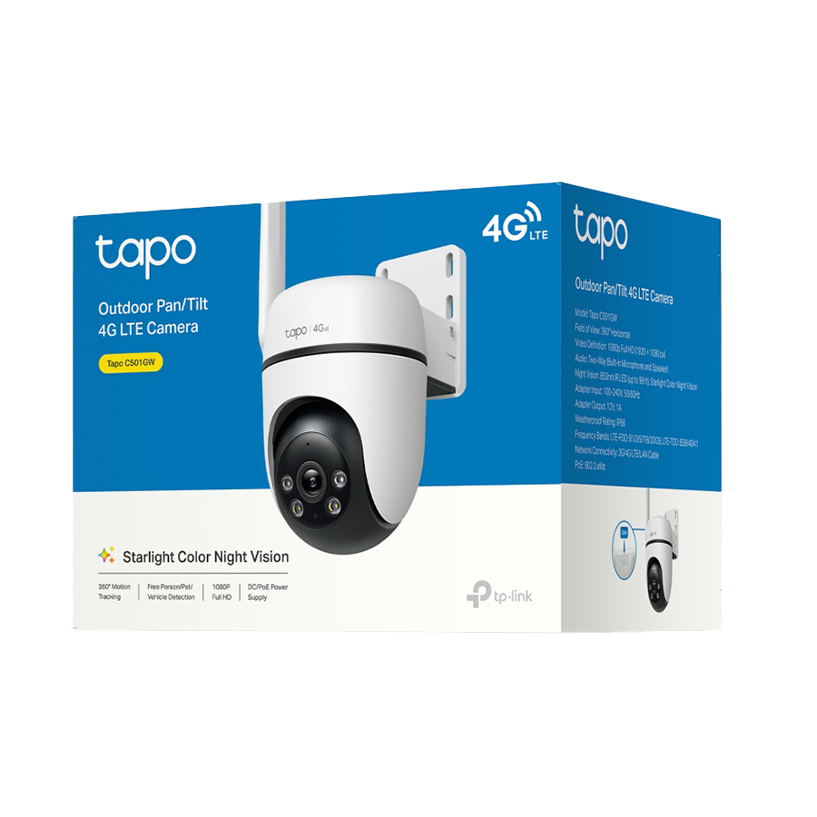 TP-Link Tapo C501GW Outdoor Pan/Tilt 4G LTE Camera, 1080p (1920×1080), 4G LTE, 1 x External Antenna, 1 x PoE Port, Horizontal 360, Pan/Tilt, Starlight Color Night Vision, Smart AI Detection and Notifications (motion, people, pets, cars)