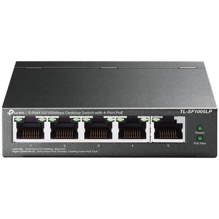 TP-Link TL-SF1005LP 5-Port 10/100Mbps Desktop Switch with 4-Port PoE+, 41 W total PoE budget, PoE Auto Recovery, Up to 250m data and power transmitting range under Extend Mode, Priority Mode, Fanless design, Desktop/Wall-mounting,Durable Metal Casing