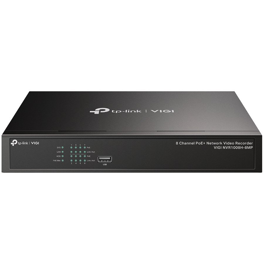 TP-Link VIGI NVR1008H-8MP 8 Channel PoE Network Video Recorder, H.265+/H.265/H.264+/H.264, Up to 8MP resolution,80 Mbps Incoming Bandwidth(up to 8 channels),8×10/100 Mbps PoE+ Ports, PoE Power 113W, 1×SATA Interface(up to 10 TB),2×USB 2.0,1×HDMI