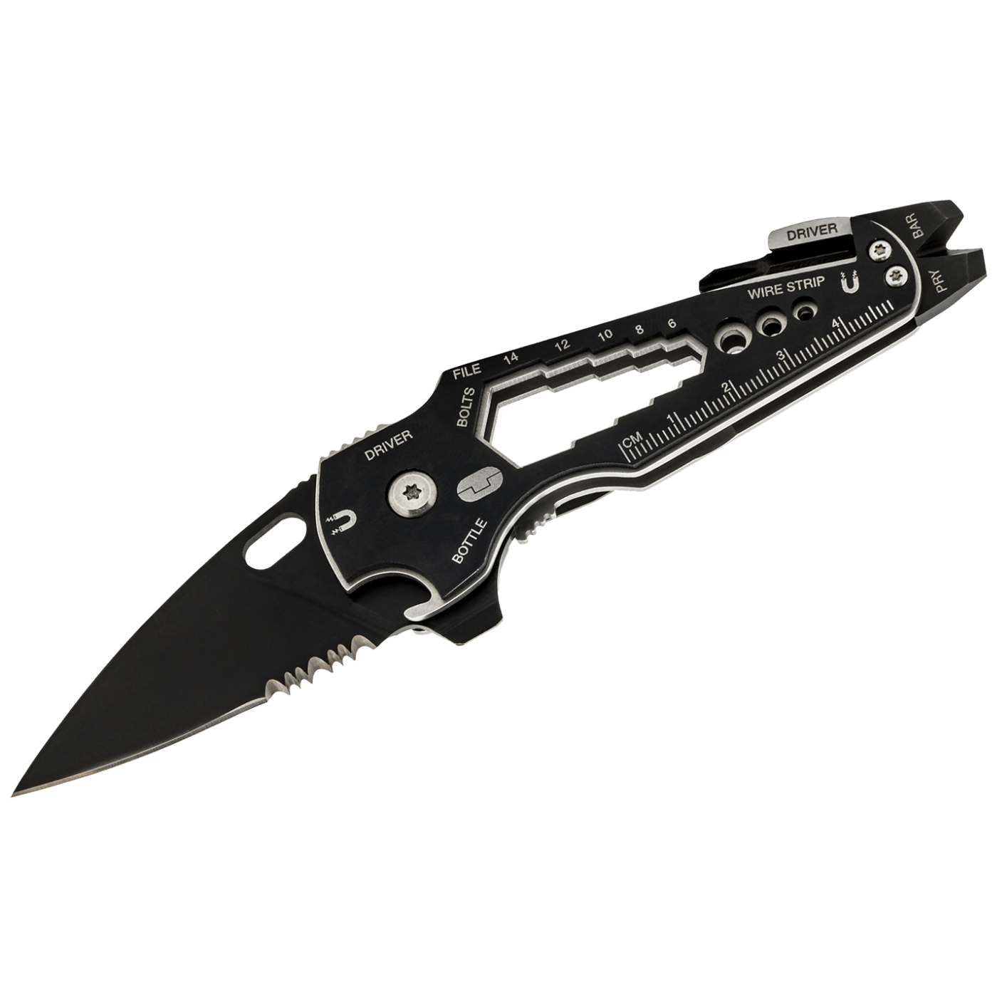 Višenamjenski džepni nož s 15 osnovnih alata: mali / srednji / veliki odvijač s ravnom glavom, ravnalo s anglosaksonskim i metričkim gradacijama, skidač kabela u tri veličine, ključ 6 mm / 8 mm / 10 mm / 12 mm / 14 mm, otvarač za boce, magnetizirana stezna glava 1/4 ", kopča za remen, zatezač, glava turpije, magnetska zvijezda bit glava