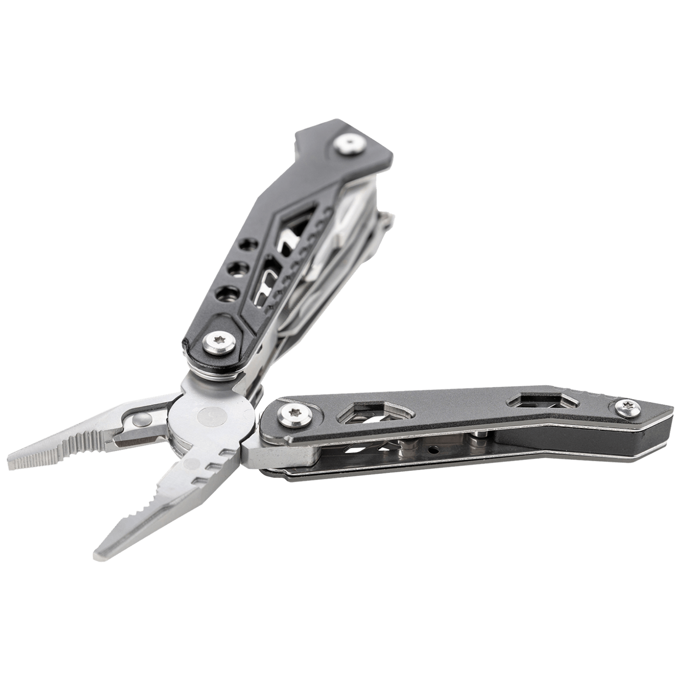 Ima ergonomsku čeličnu ručku, kliješta od nehrđajućeg čelika s oprugom, rezač žice, plosnati odvijač, turpiju, Phillips odvijač, pilu, otvarač za boce, nož dužine od 7 cm, magnetni držač glave bita, 3 Phillips, 1/8 ", 3/16" i 1/4 " ravna glava i H3, H4 i H5 hex