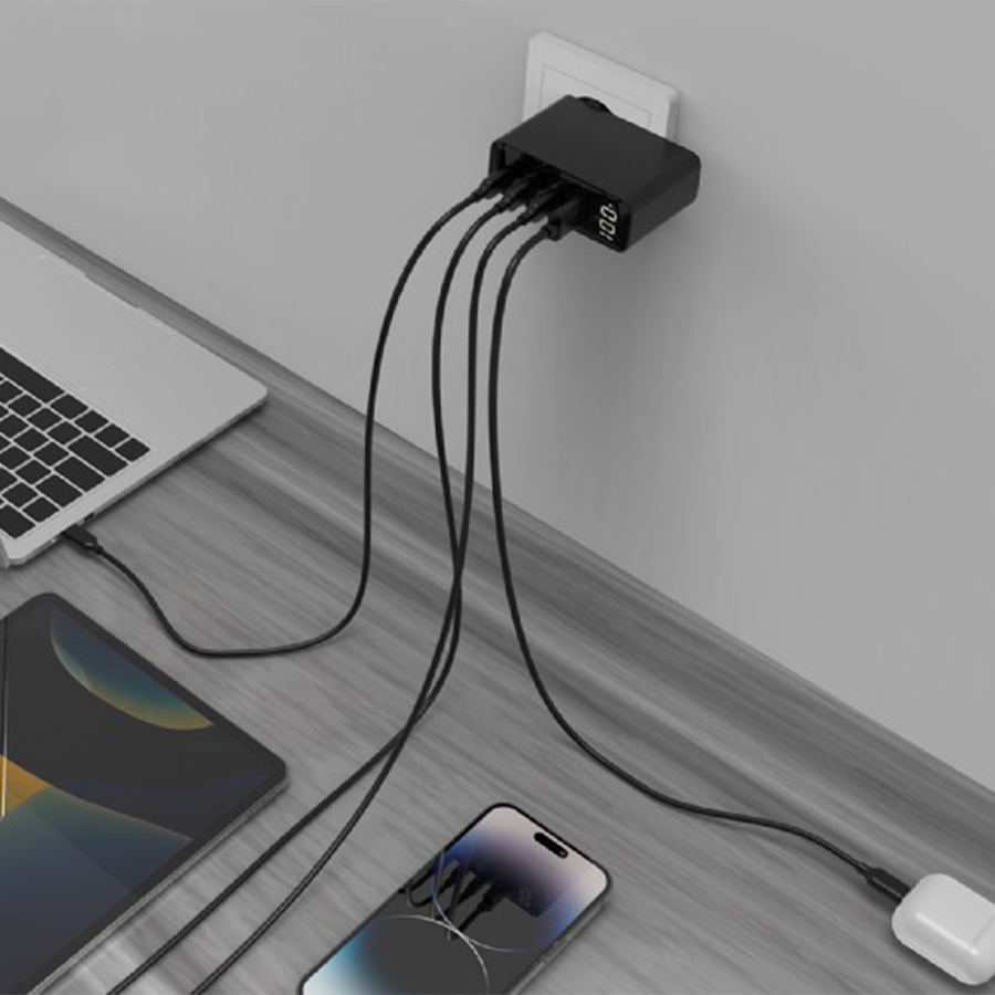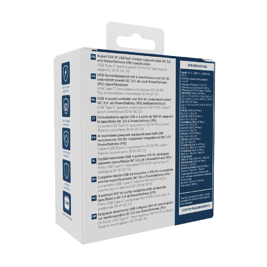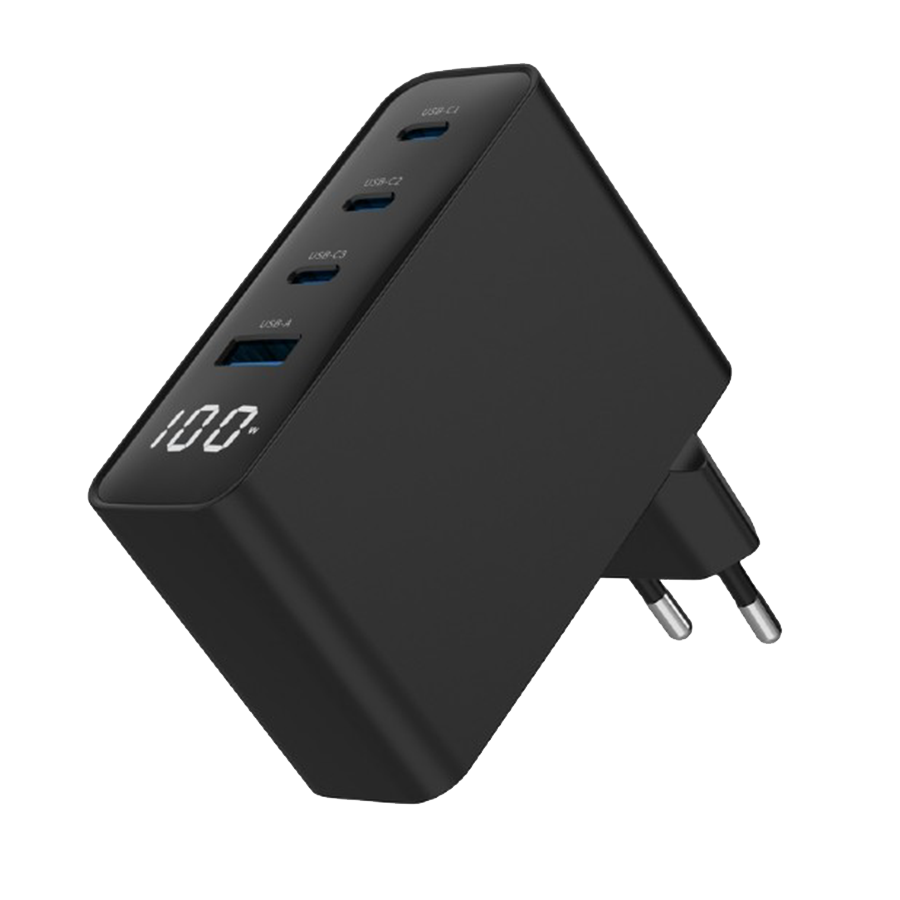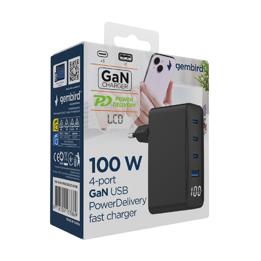 USB punjač 3xType-C + USB-A , 4-port 100W GaN USB fast charger, LCD, black, GEMBIRD, TA-UC-PDQC100LCD-01-BK