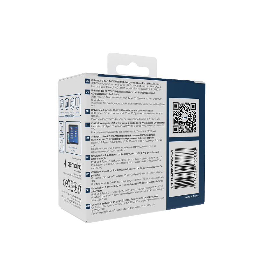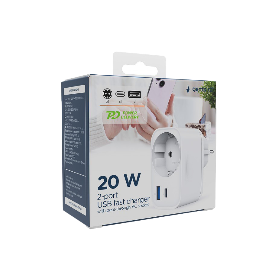 USB punjač Type-C + USB-A + shuko, 3A, white GEMBIRD, TA-ACPDQC20-01-W