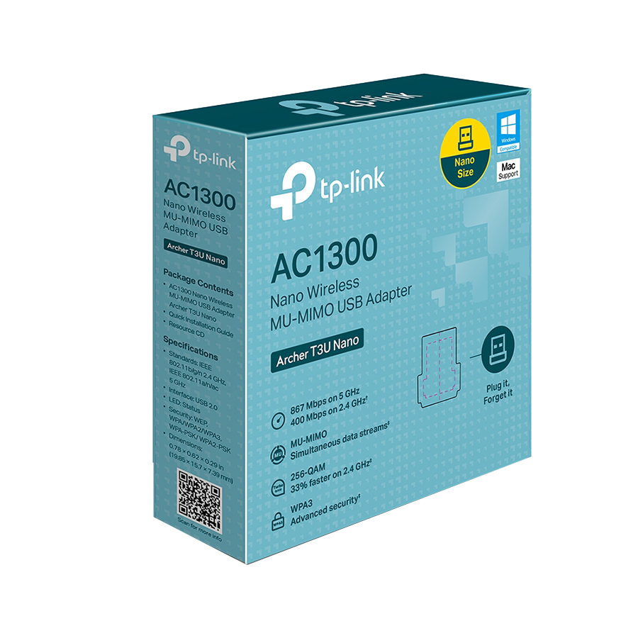 TP-Link Archer T3U Nano AC1300 Nano Wireless MU-MIMO USB Adapter,Nano size, 867Mbps at 5GHz + 400Mbps at 2.4GHz, USB 2.0, WPA3, Supports Windows 11/10/8.1/8/7, Mac OS 10.15 and earlier