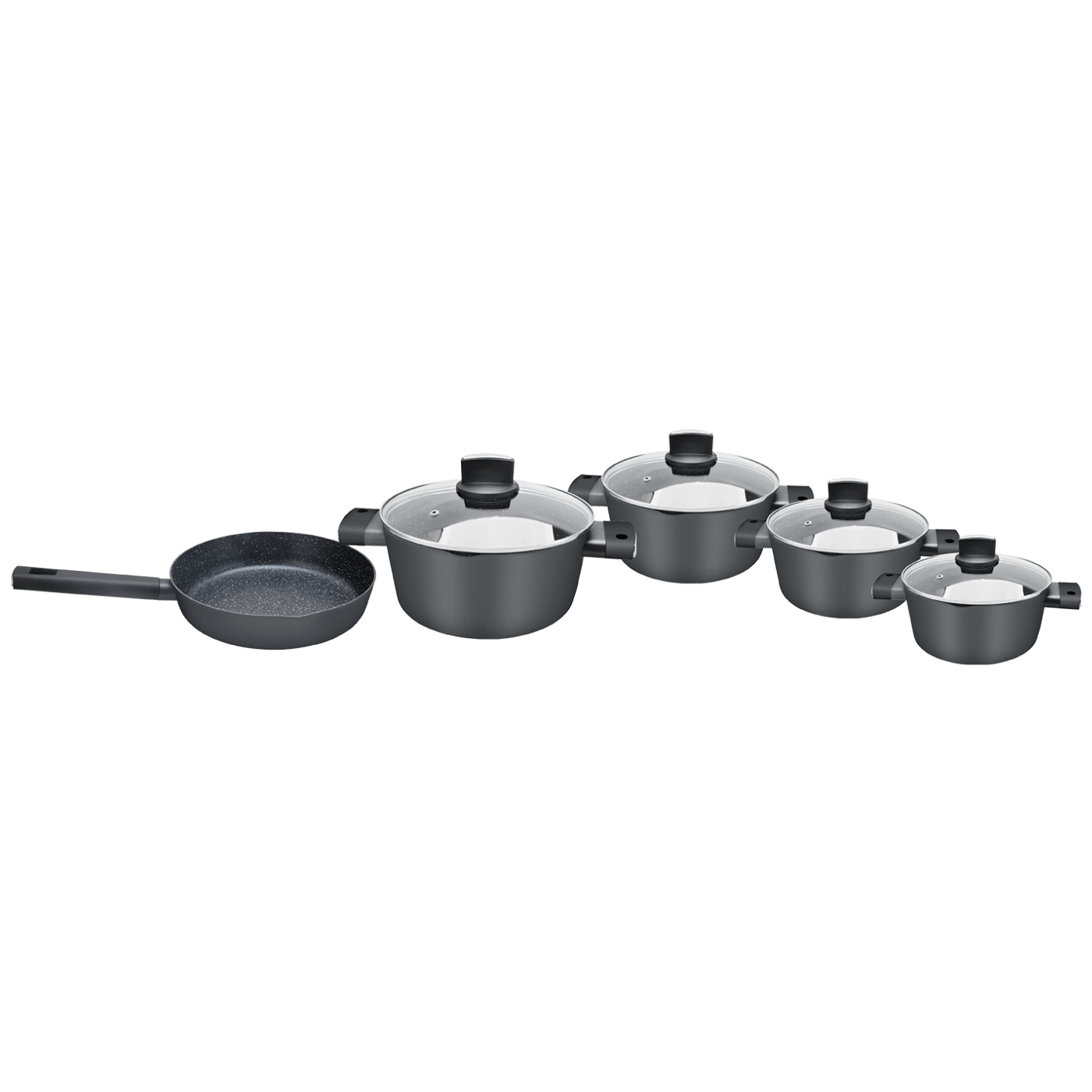 Set se sastoji od: 4 šerpe ( 18, 20, 24, 28 cm), 1 tava 26 cm, 4 staklena poklopca otporna na visoke temperature.